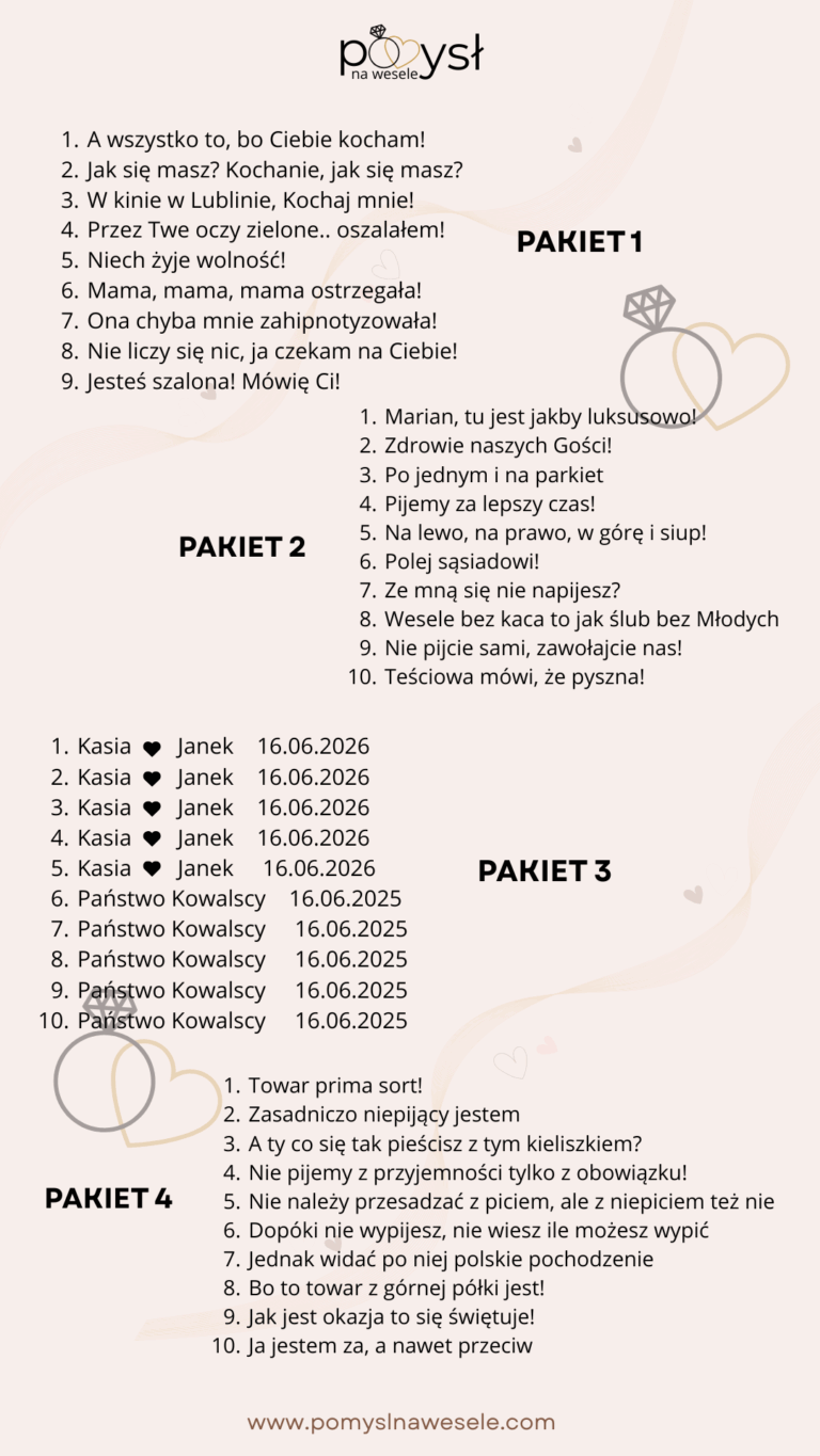 Każda wstążka to fragment kultowej piosenki – od romantycznych hitów po taneczne przeboje, które zna cała sala. Idealne do wódki, wina czy prosecco – będą świetnym dodatkiem do wystroju i świetnym pretekstem do wspólnego śpiewania i toastów!